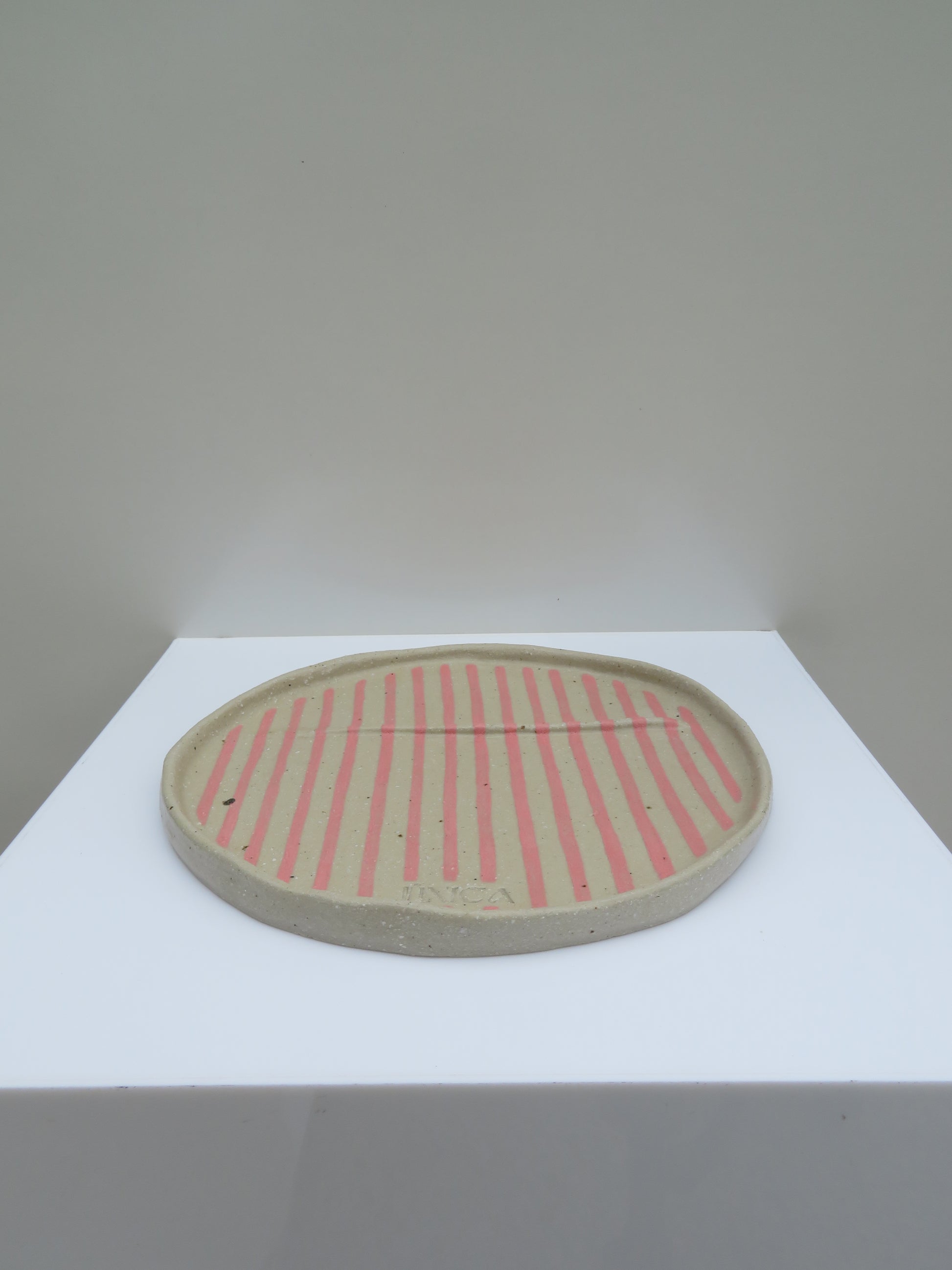 The "Two Sided Plate" is a complimentary addition to any kitchen or living space. Crafted from stoneware clay and finished with a Soft Pink striped glaze, it brings a gentle, inviting beauty to its surroundings. With a two-sided design for multipurpose practicality, this plate is both playful and full of charm.