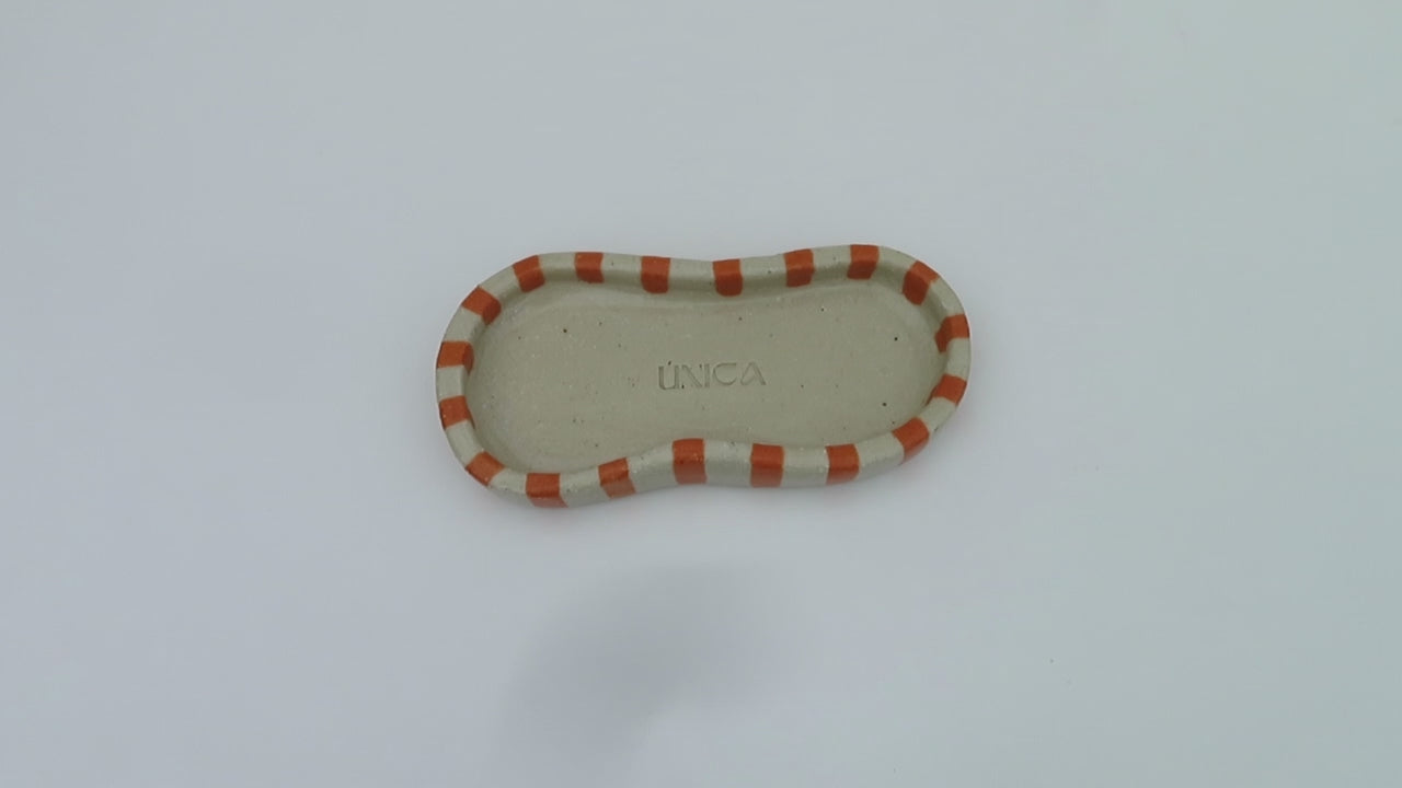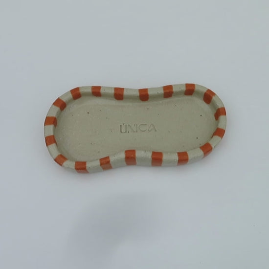 The "Waved Jewellery Tray" is a unique, eye-catching piece that adds charm to any space. Crafted from stoneware clay and finished with a Sweet Orange striped glaze, its soft, wavy curves beautifully complement the jewellery or treasures placed within. Practical yet decorative, this tray brings a touch of warmth and personality to your everyday.